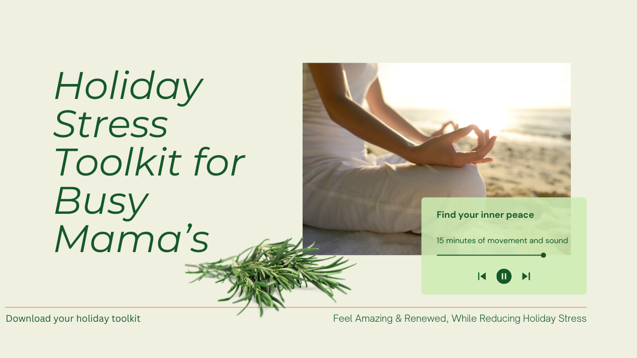 The combination of breath, movement and sound healing work with the body and energy of the cells to change the frequency of the body and bring it back into natural alignment with the earth. I use the sound current of Om to calm the nervous system and relax the muscles helping reset your chemical stress response in the body. Adding the healing powers of Rosemary through the senses bring natural healing and ease to the body. This unique combination of breath, kundalini movement, sound therapy and herbalism is the key to a fully embodied and intentional method to move out of the stress response and cycle our daily lives become during the busy holiday season as a mom.